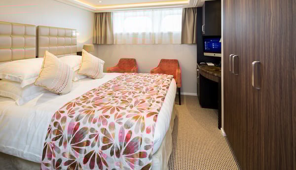 A comfortable river-view stateroom featuring a fixed window, plush bedding and modern amenities. Thoughtfully designed, it offers a cosy retreat after days exploring Europe’s waterways.