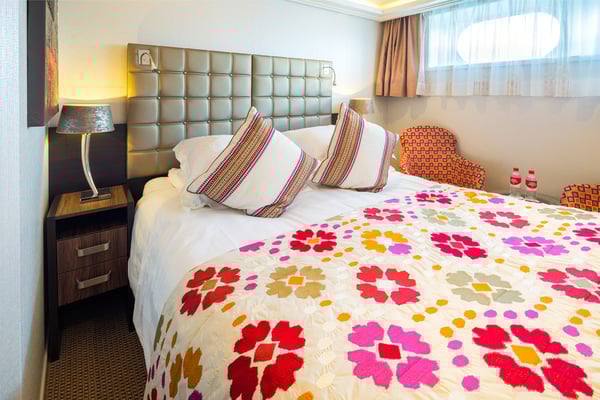 A comfortable river-view stateroom featuring a fixed window, plush bedding and modern amenities. Thoughtfully designed, it offers a cosy retreat after days exploring Europe’s waterways.