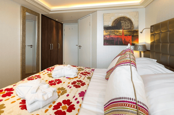A comfortable river-view stateroom featuring a fixed window, plush bedding and modern amenities. Thoughtfully designed, it offers a cosy retreat after days exploring Europe’s waterways.