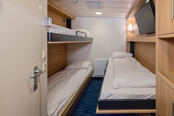 These comfortable, standard inside cabins for up to three people∘ on the upper deck have separate beds, one of which converts into a sofa and upper/lower berths.