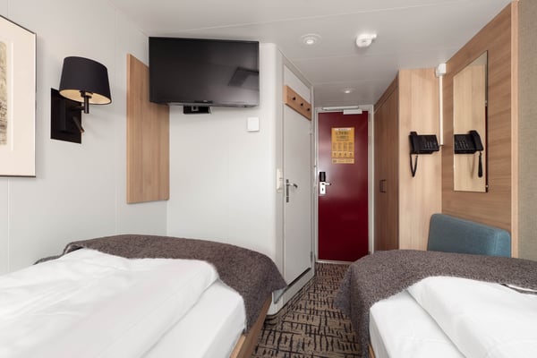 These comfortable outside cabins for up to two people on the middle deck have separate beds, one of which converts into a sofa.