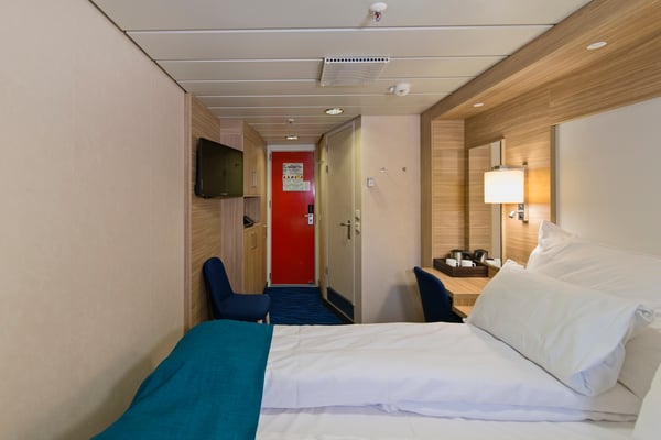 Refurbished outside cabin on the upper decks for two people, with a double bed, extra chair and TV. These cabins have limited views.