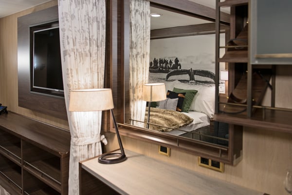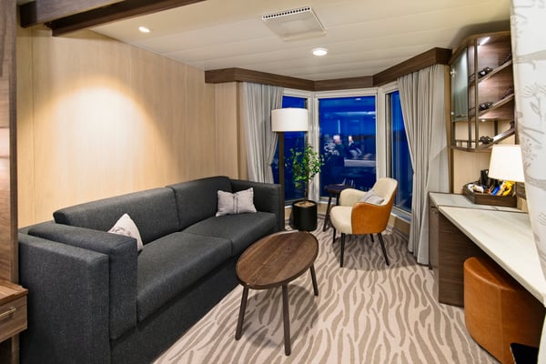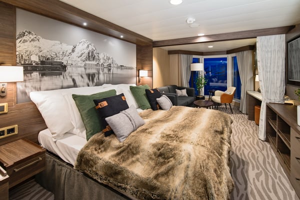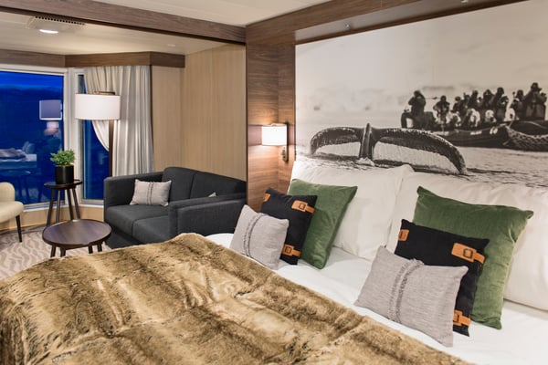 Refurbished expedition suite with bay windows on upper deck. The suites have double beds and extra sofa beds, TV and minibar.