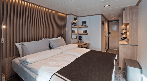 Bright, spacious cabins with large windows or portholes for ocean views.