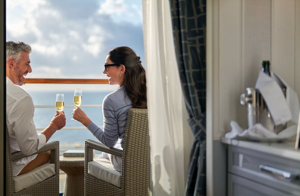The Veranda Stateroom offers floor-to-ceiling glass doors opening onto a private balcony. Enjoy plush bedding, a cosy seating area and elegant décor that reflects Oceania’s distinctive sense of comfort and style.