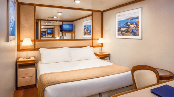 These staterooms are the perfect place to recharge your batteries. Our most affordable option, featuring two twin beds or a queen-size bed. Other amenities include a refrigerator, hair dryer, TV, closet and bathroom with shower.