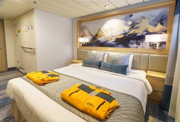 Designed for one. These cabins are located on Deck 3 and are approximately 166 sq. ft. (15.4 sq. m) in size, featuring one double bed and a porthole view. There is also a desk and chair, a TV, a state-of-the-art ‘infotainment’ system, and a private bathroom with a shower, vanity, and heated floor.