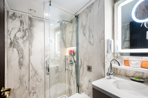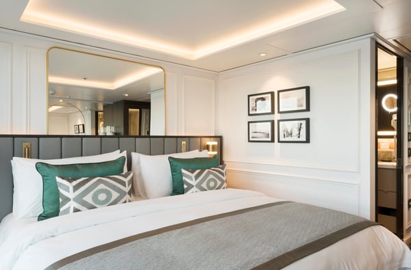 A serene retreat with elegant décor, floor-to-ceiling windows, and luxurious bedding. Perfectly designed for comfort, offering a peaceful space to unwind after days ashore.