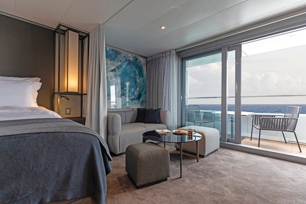 Elegant suite with separate bedroom and living space, sliding doors to verandah.