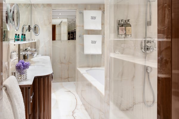 The Grand Suite offers extra benefits, including a separate spacious living room, bathroom with a separate rain shower and tub, and secluded toilet and bidet area