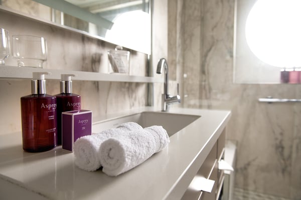 - Large bathroom with Asprey bath and body products, plush towels, comfortable bathrobes and slippers, double sink vanity, and rain shower